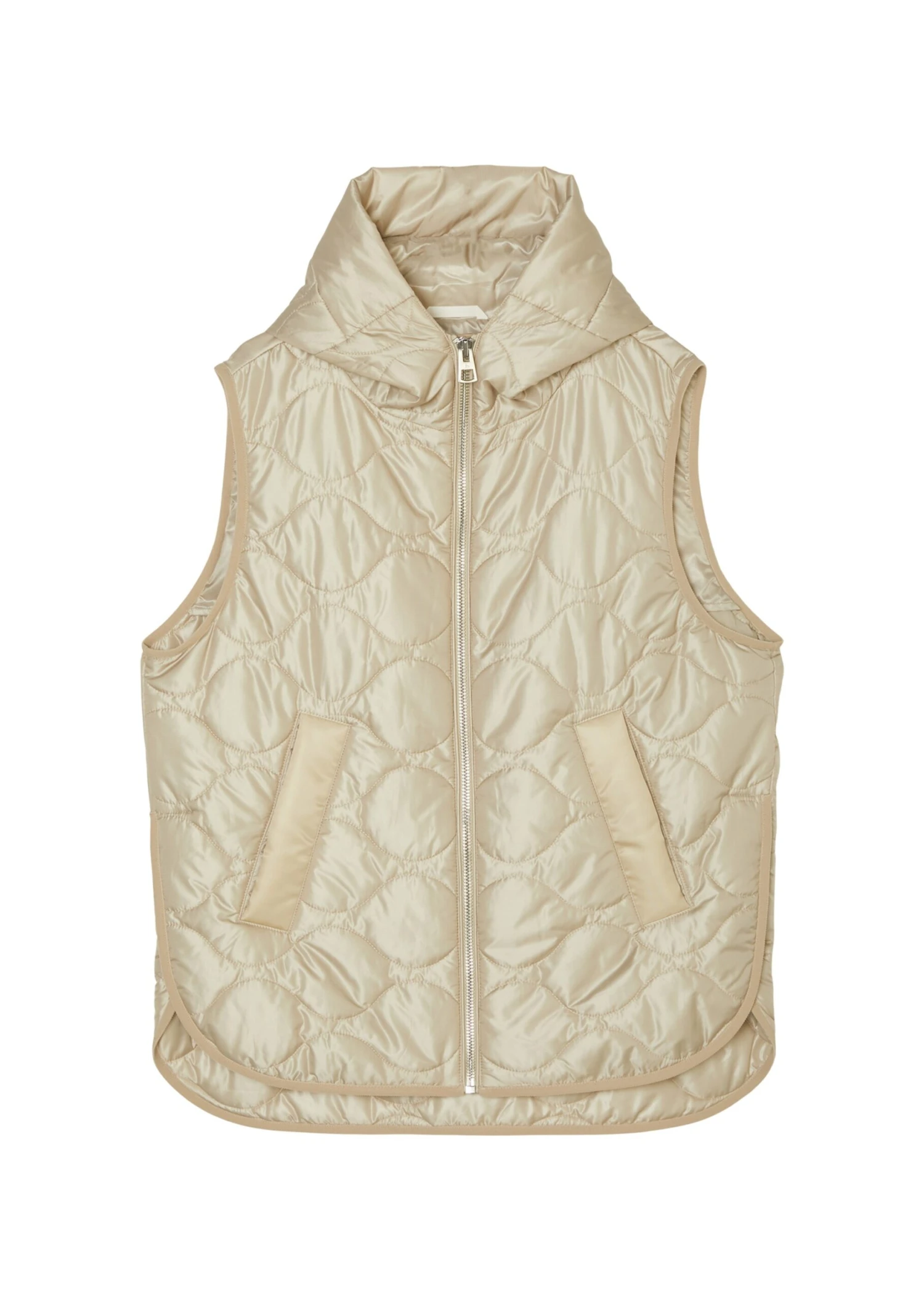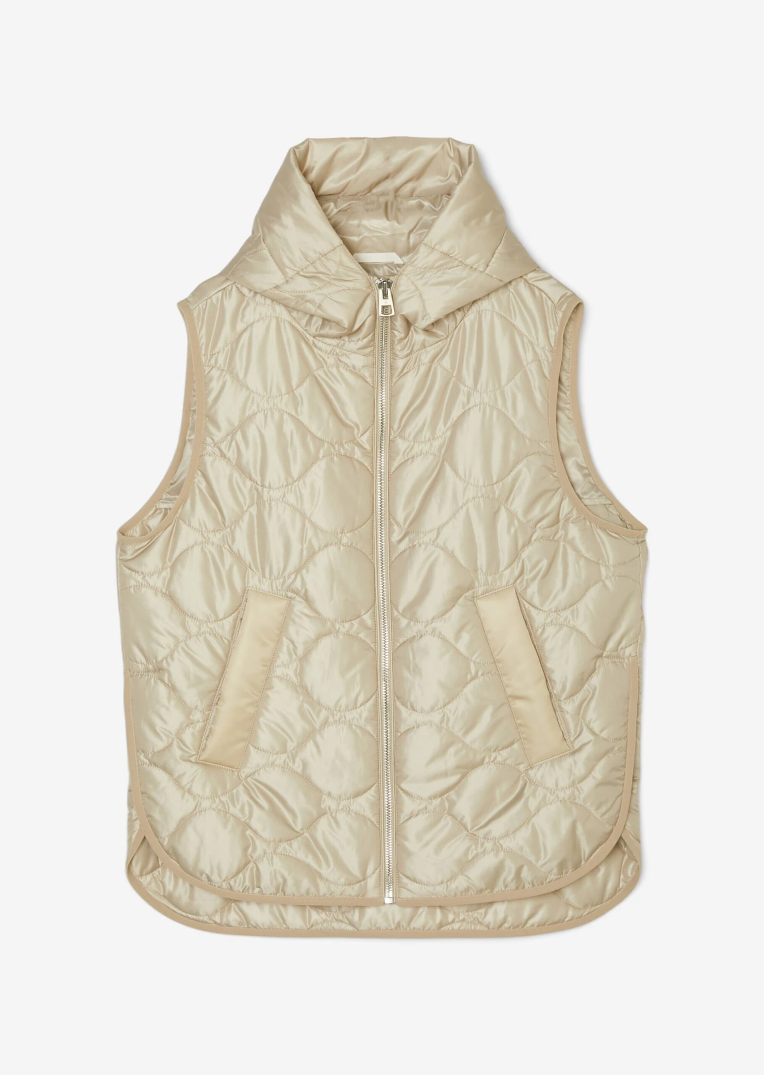 We have no desire to let wind and weather spoil our styling mood. Perfect to counteract this: the layering look. The super-casual hoodie quilted vest in cape style immediately gives every outfit a proper portion of sophistication and coolness. Relaxed cut model with a large hood, high-quality metal front zipper, wide welt welt pockets, slightly overcut shoulders, a rounded hem line and side seams that open with snaps. The vest is crafted from a recycled, water-resistant poly ripstop and padded with Unifi REPREVE®. This is our alternative to down feather – it provides high heat retention, resists moisture and has a soft, feathery feel. All outer fabric and lining materials are recycled, sustainably produced and environmentally friendly. Enhances the look of the vest: the hemmed edges.