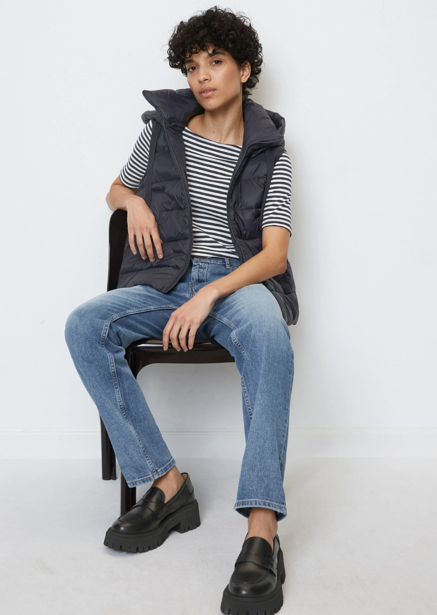 This ultra-lightweight, hooded quilted puffer body warmer is a great all-rounder for casual, layered looks on cold days. It features a water-resistant nylon shell, a smooth-running front zip and two in-seam zip pockets. The high-quality Unifi REPREVE® padding provides a high level of heat retention, is moisture-resistant and is soft and bouncy to the touch. The sandwich design is worth a special mention – the outer fabric is also used as the lining! All materials are recycled, sustainable and produced in an environmentally-friendly way. This piece features a high collar, a button-off hood, elegant matte press studs, a wide woven drawstring and practical button plackets to open the side seams.