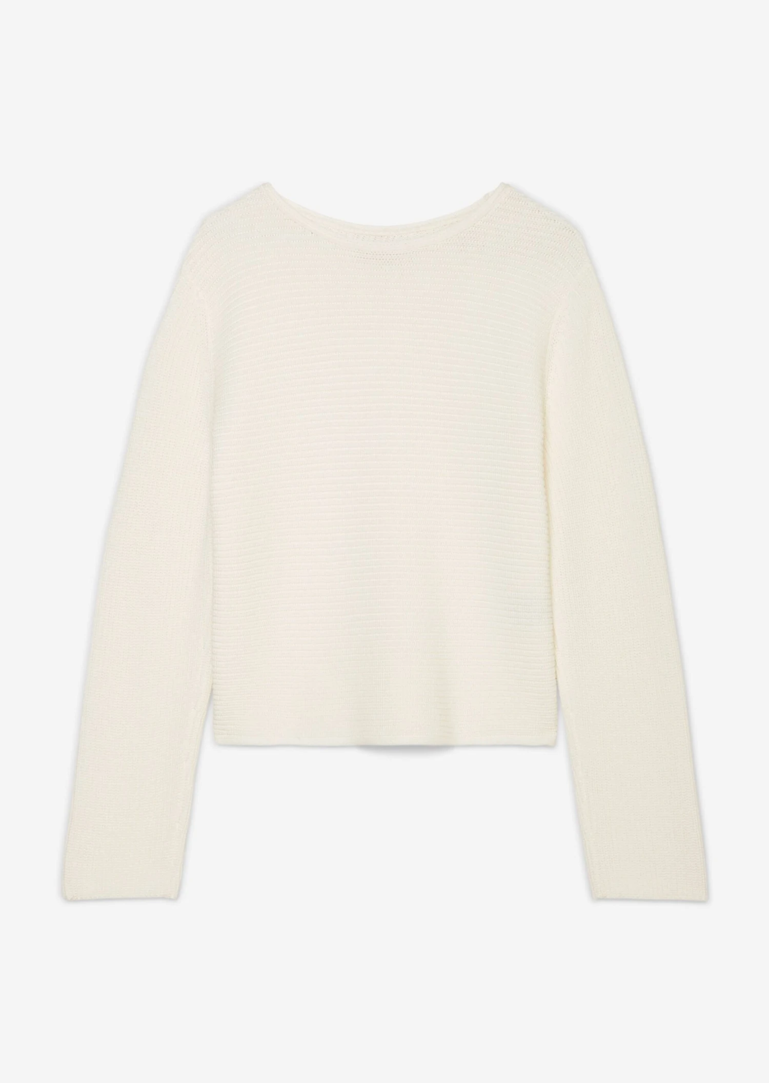 Summer knits are perfect on warm days! Quite casual while remaining simple with a special twist – our cotton jumper comes in a horizontal knit in soft, heavy organic cotton yarn. The relaxed fit design has a round neckline, dropped shoulder and fully fashioned details. Better together – wearing it with a knitted skirt in the same colour creates a fantastic, modern “set” look.