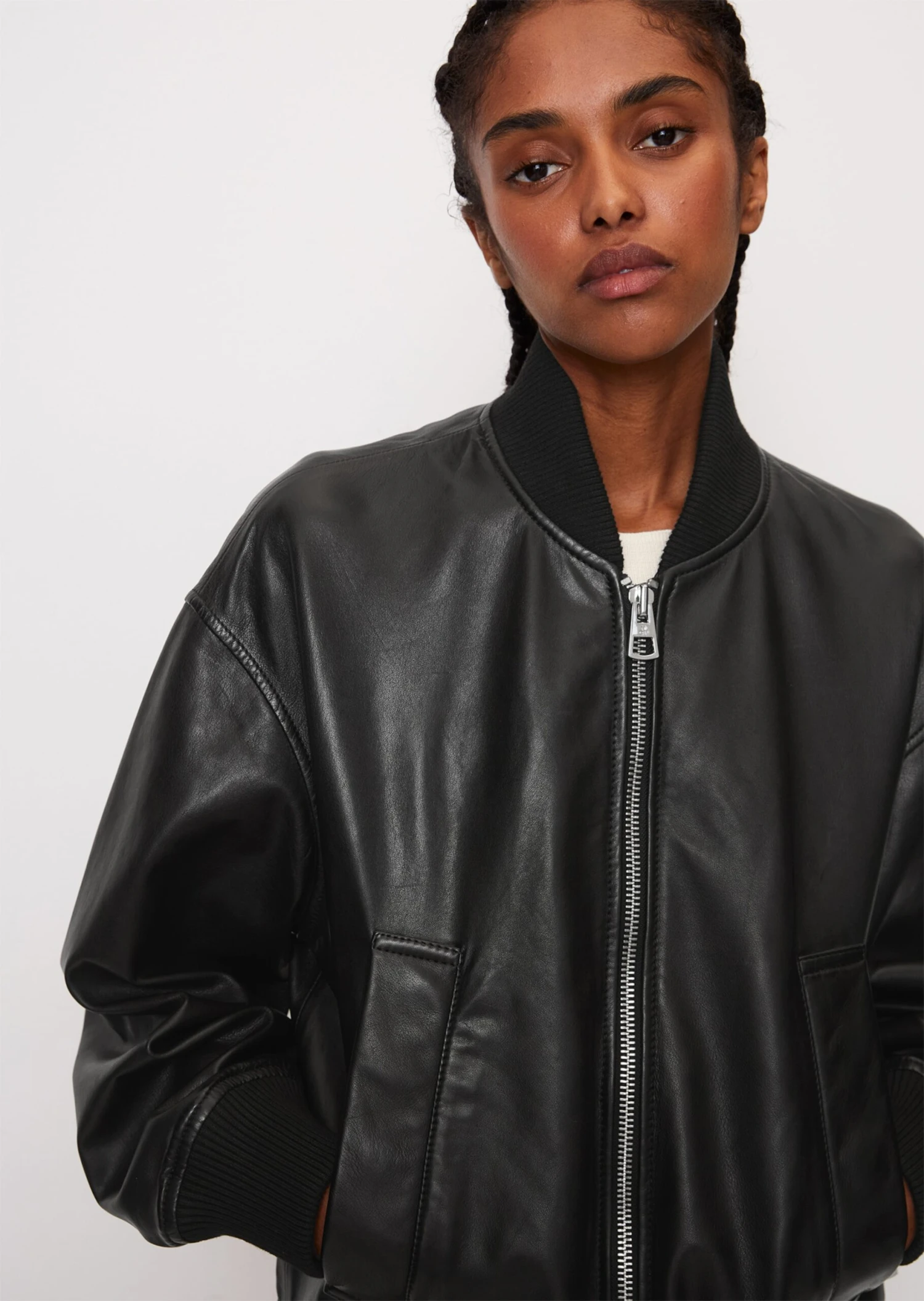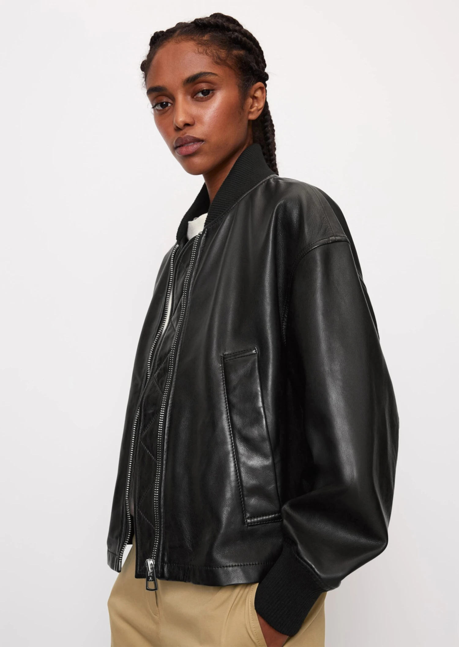 We predict: this leather jacket has the ultimate must-have potential. It works with every look – from a rebellious biker look with jeans and boots to an evening outfit with a long dress and sandals. This jacket in the style of a cape made of super soft, smooth lamb leather is unlined and inspired by the bomber jacket – the collar and sleeve cuffs are reminiscent of the timeless aviator jacket. The cut is new – casual, slightly flared, slightly cropped, with practical, roomy welt slash pockets. Special: the leather underside has a special finish that prevents leather dust particles from transferring onto underwear. Which is why the little jacket doesn’t need any lining.