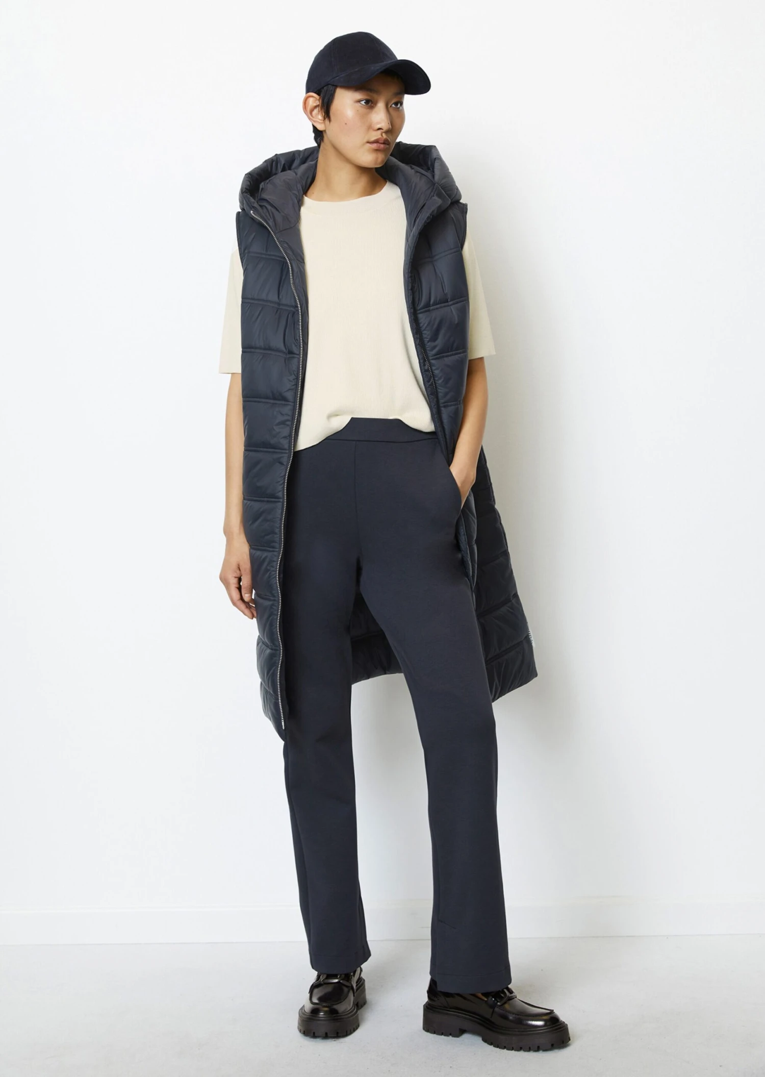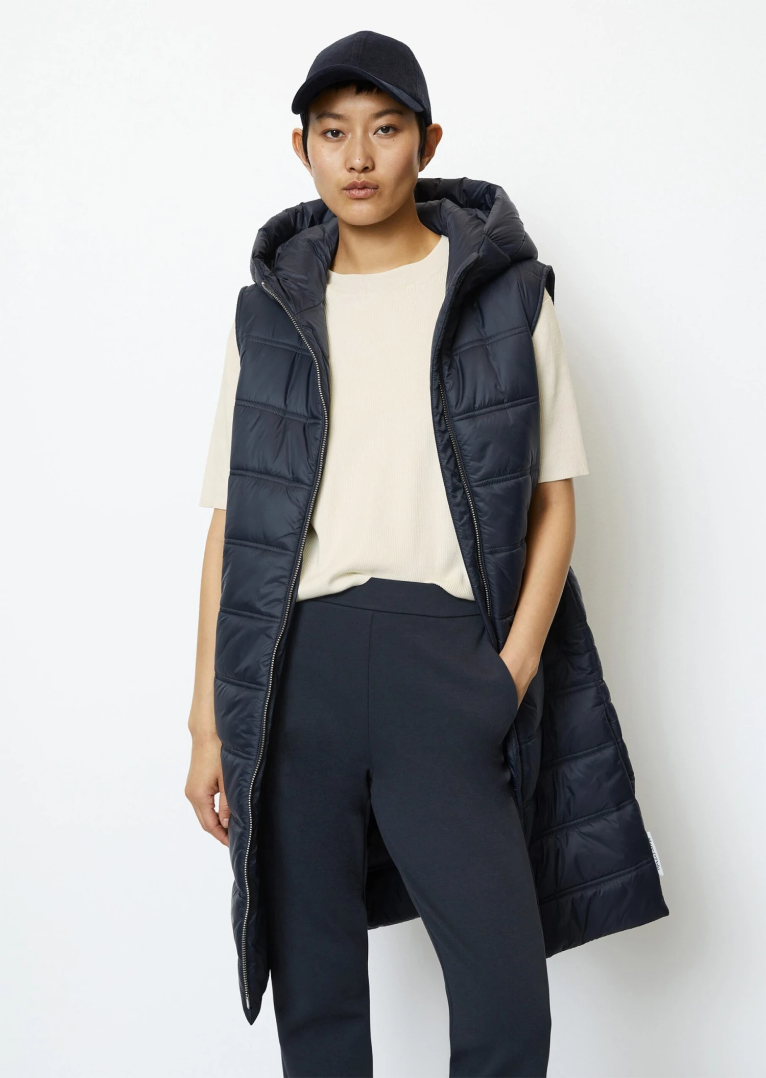 In addition to our beloved quilted coats, we’re also wearing ultra-practical, long and super stylish hooded quilted body warmers this season. It can become part of any look and goes with both jumpers and dresses. The casual, lightweight design is made of high-quality, recycled nylon fabric with a large, fixed hood and generous, spacious welt slit pockets. The padding by Unifi REPREVE® is our alternative to down – it provides a high level of heat retention, is moisture resistant and is soft and bouncy to the touch. All woven materials are recycled, sustainable and ecologically produced. The sandwich design is worth a special mention – the outer fabric is also used as the lining! New: the chambers for the filling are finished with double-layer topstitching for an innovative, more modern look. The features: a two-way front zip with a backed storm placket, a water-repellent outer surface and button-fastening side seams.