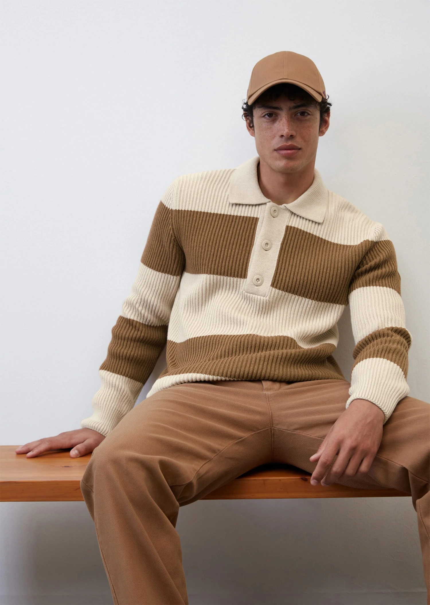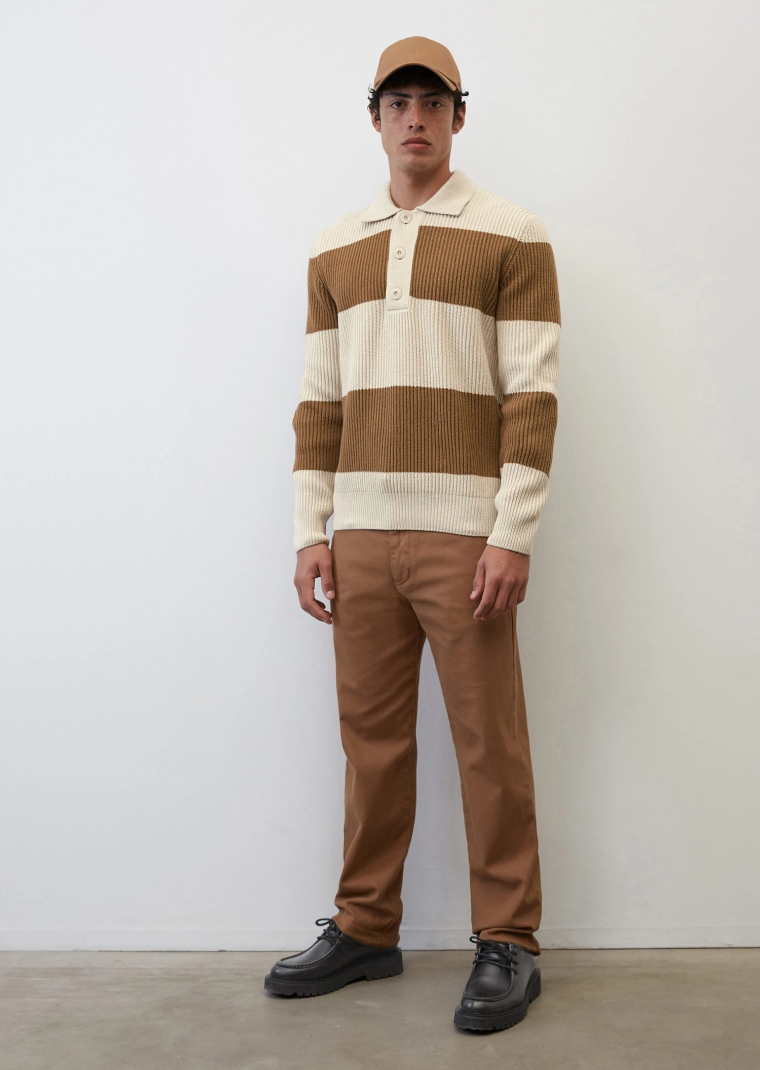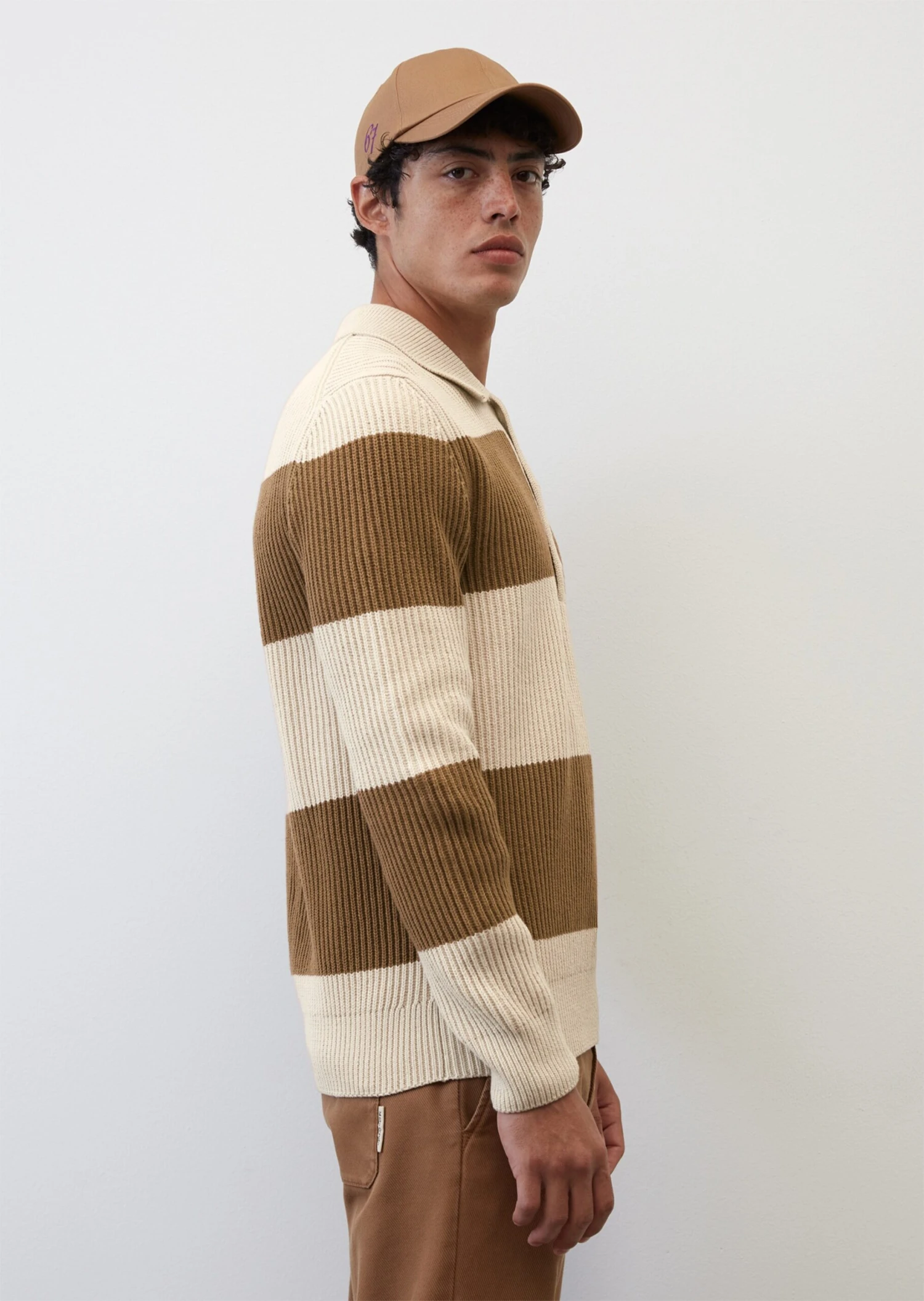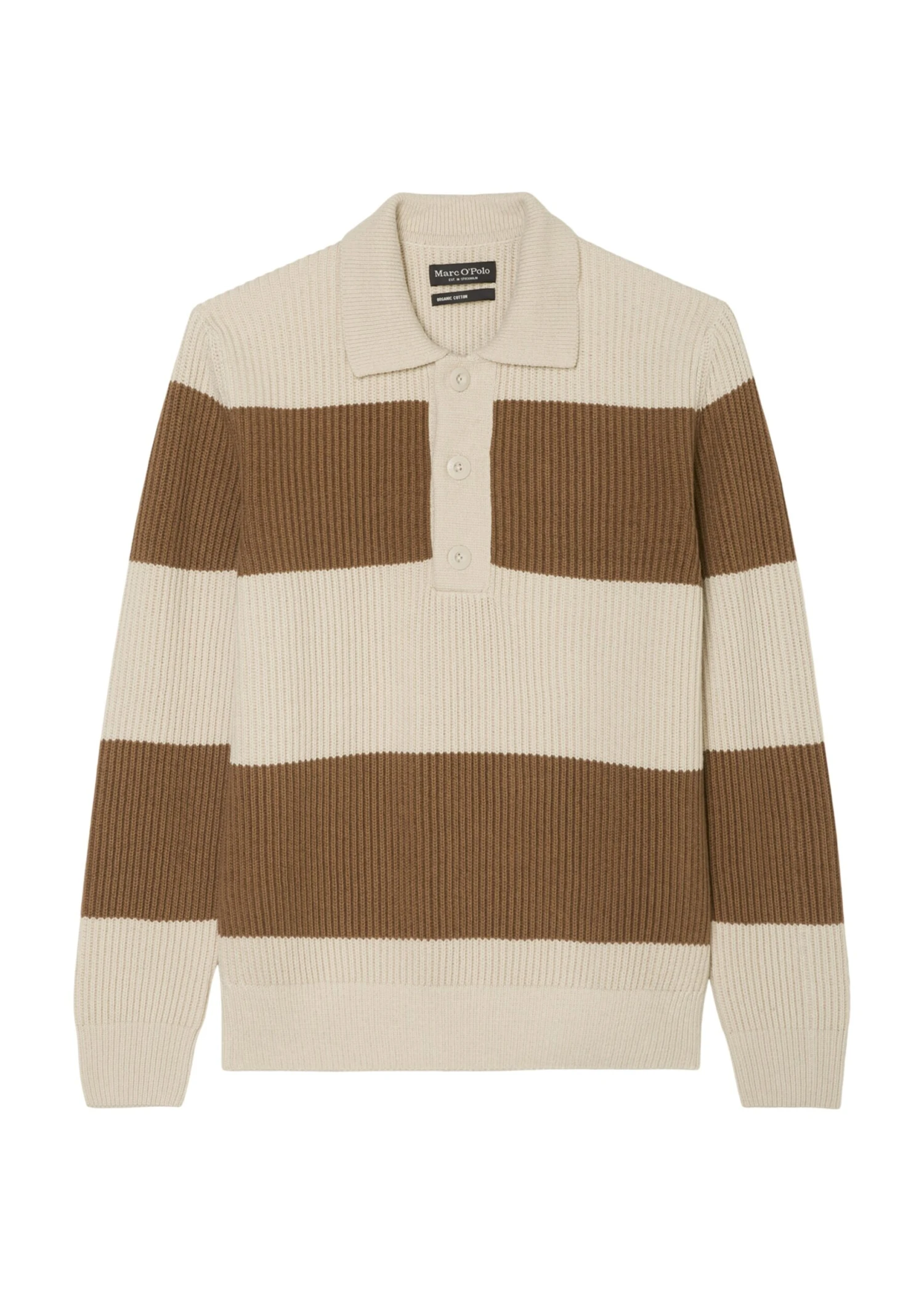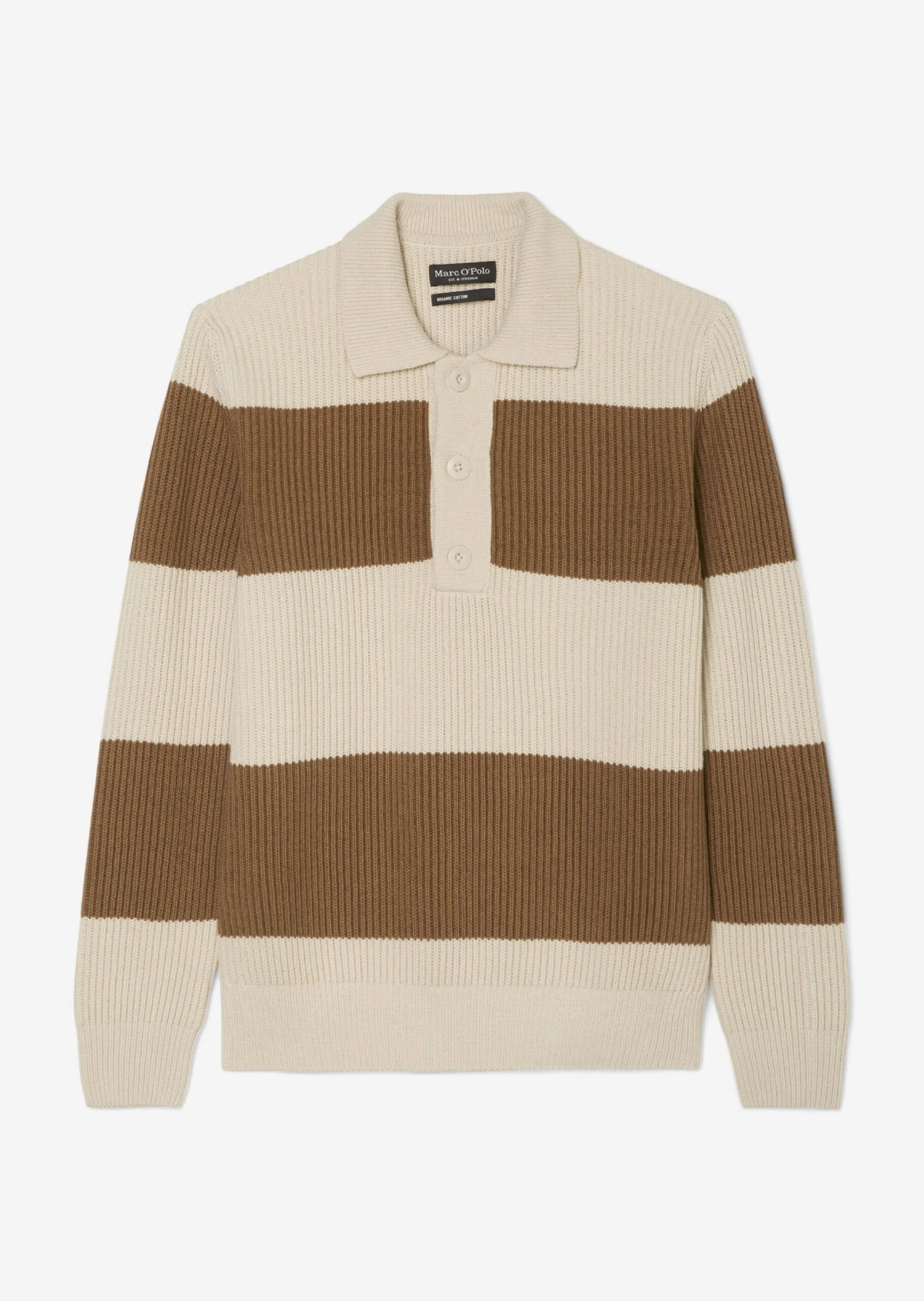 This high-quality chunky knit jumper is inspired by the sporty polo shirt and comes with a typical flat knit collar and a short button placket. It comes in a relaxed fit and is made of a mix of organic cotton and new wool in a rib knit design. The yarn-dyed block stripes and the large logo buttons give this piece a modern look. The long sleeves and hem are finished with compact trims. There is a subtle logo label on the side seam.