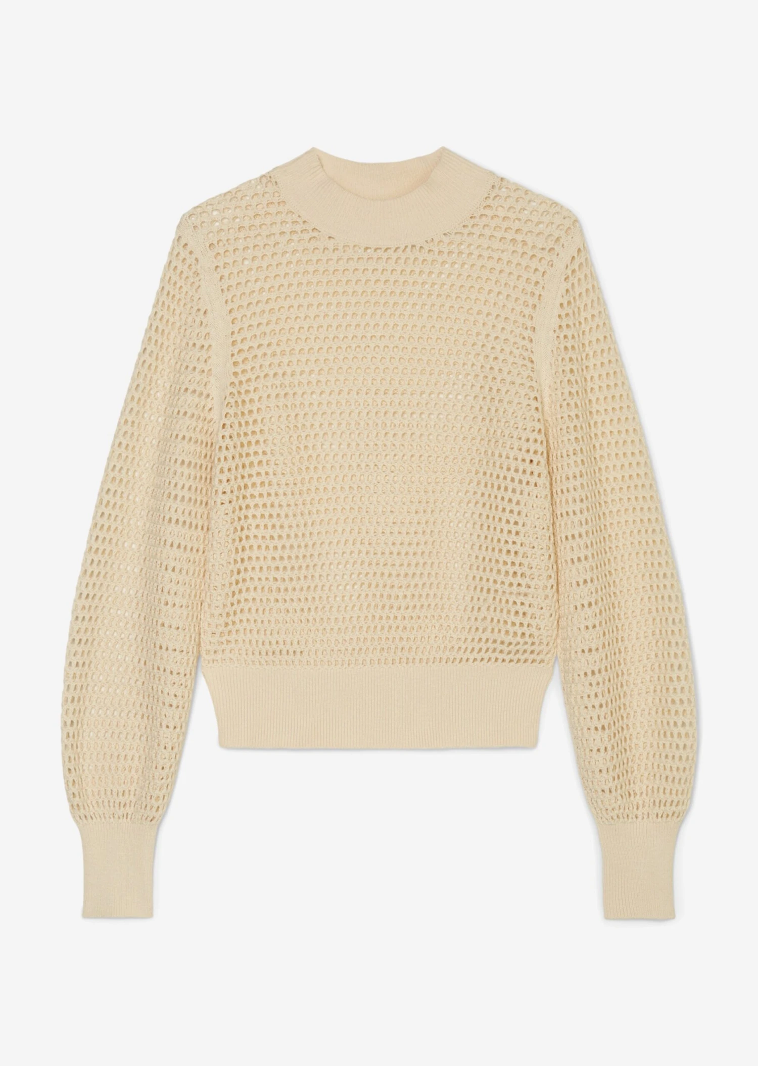 The latest knitwear creation is soft, casual and airy – the cropped long sleeve jumper with an extremely trendy openwork pattern in a mesh look. The use of a high-quality cotton/linen blend further enhances the cooling, temperature-regulating effect of both materials. The large stitches catch the eye and create a dynamic change of colour when worn over a contrasting piece. This jumper with a high, finely ribbed collar is worn by daring fashionistas over bare skin with a crop top.