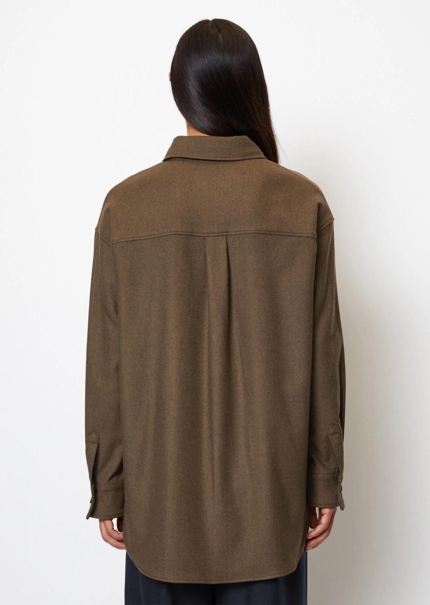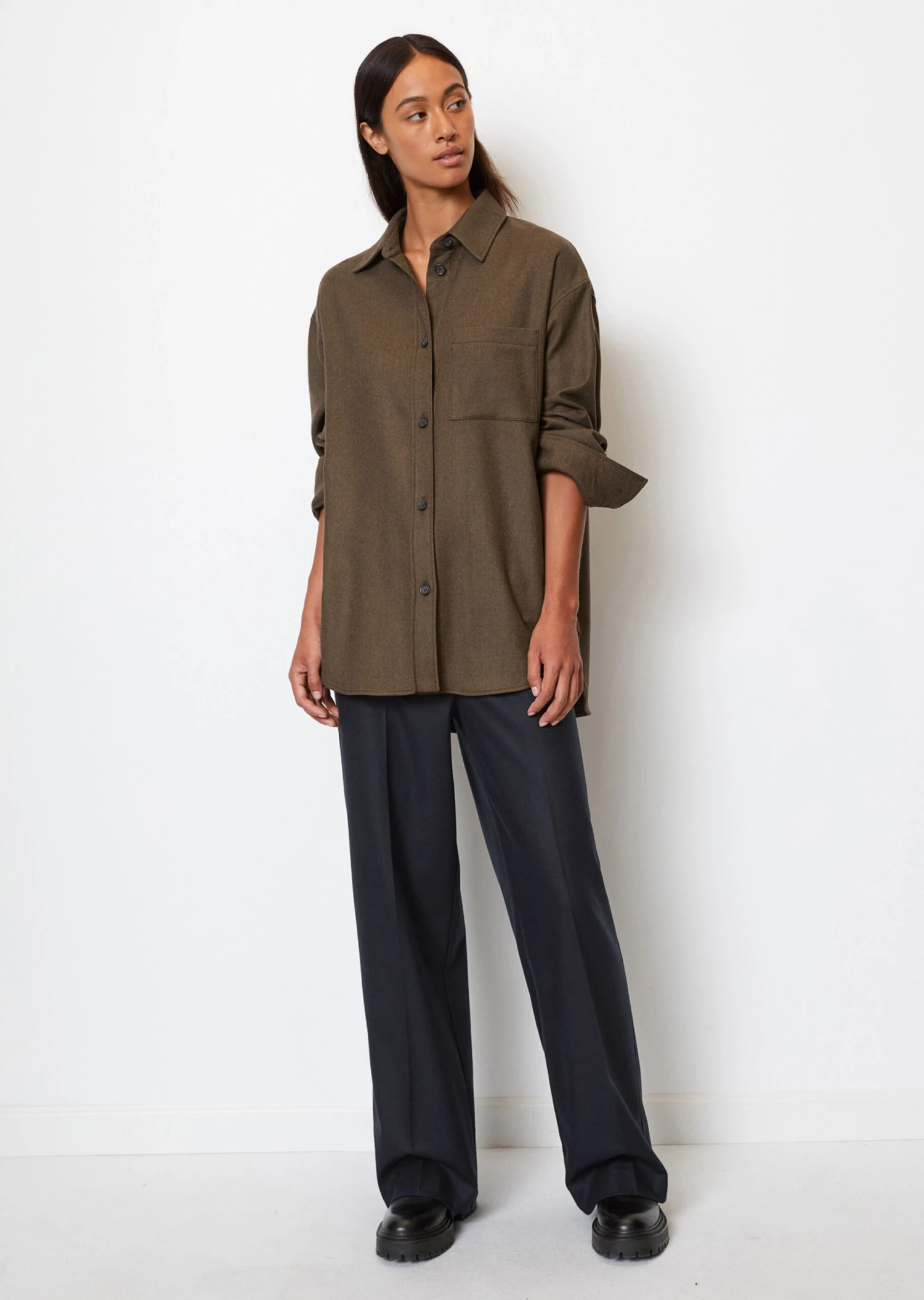 Overshirt Deluxe – always goes the extra mile in terms of fashion and, together with the matching trousers, creates a relaxed suit look. This model is made from a high-quality viscose-wool mix with a recycled fibre in a classy, flowing twill quality. The fit is loose and casual with heavily overcut shoulders and an extended back. The features: Kent collar, patch breast pocket, matching buttons, classic blouse sleeve, back yoke and pinch pleat.