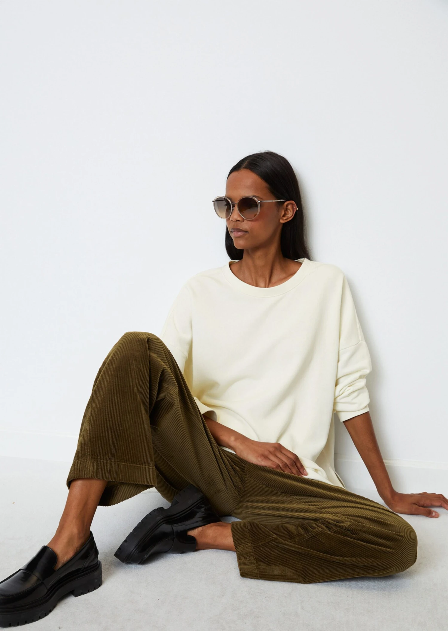 A sweatshirt is not just a sweatshirt. It is a modern statement piece. This ingeniously designed model is made of high-quality light sweat quality with characteristic terry inside made of pure organic cotton. The fit: wide, loose, long, loose in a straight H-shape with dropped shoulders, forward shoulder seams and casual, high side seam slits. The features: compact-ribbed cuffs at crew neck, cuffs and hem. The prints: subtle on the front, bold and cropped on the back.