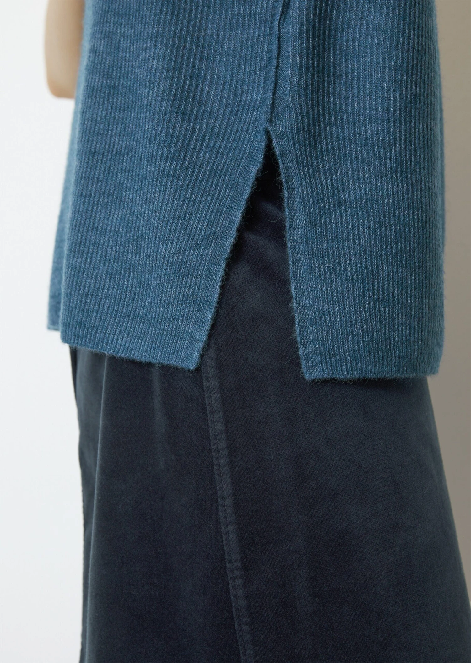We love knitwear. This cool material is right back on trend this season. Our loose-fitting top has a fine ribbed crew neck, dropped shoulders with a French finish and high side seam slits. The yarn: a classy, luxurious mix of virgin wool, nylon, elastane and cosy alpaca wool. The finish: high-quality, casual with inside-out character. The top is great with high-waist trousers and wide-leg trousers, but also looks great with the matching knitted skirt!