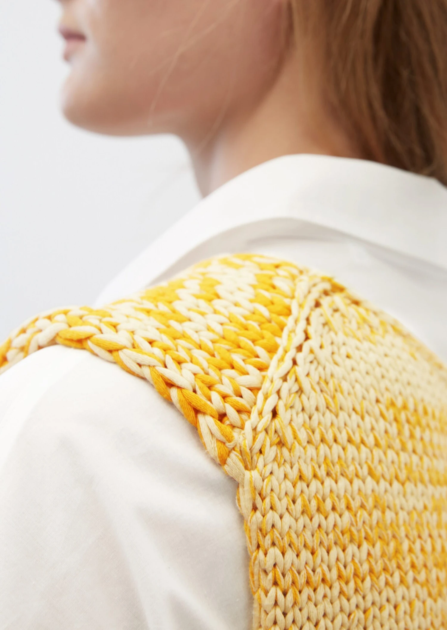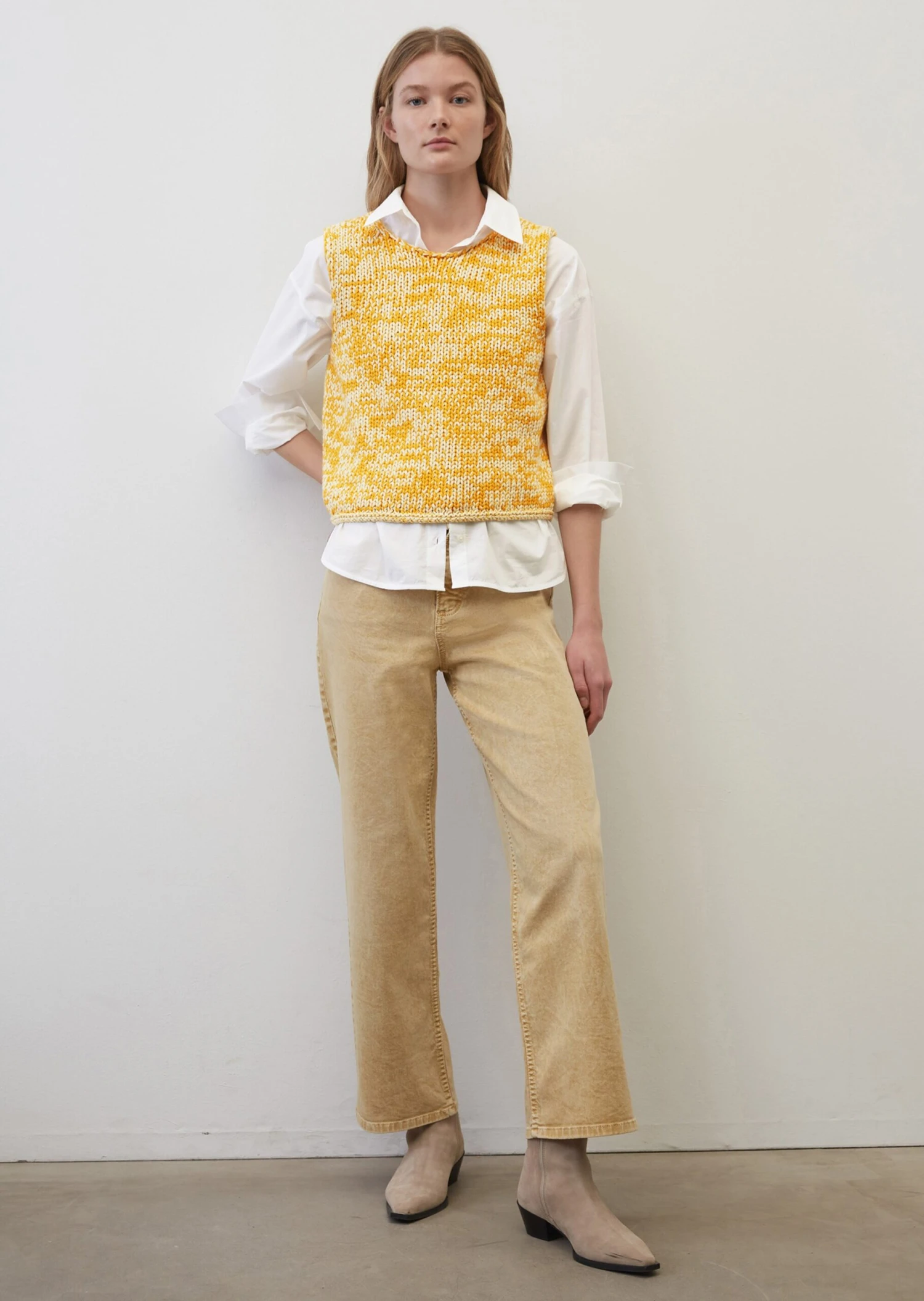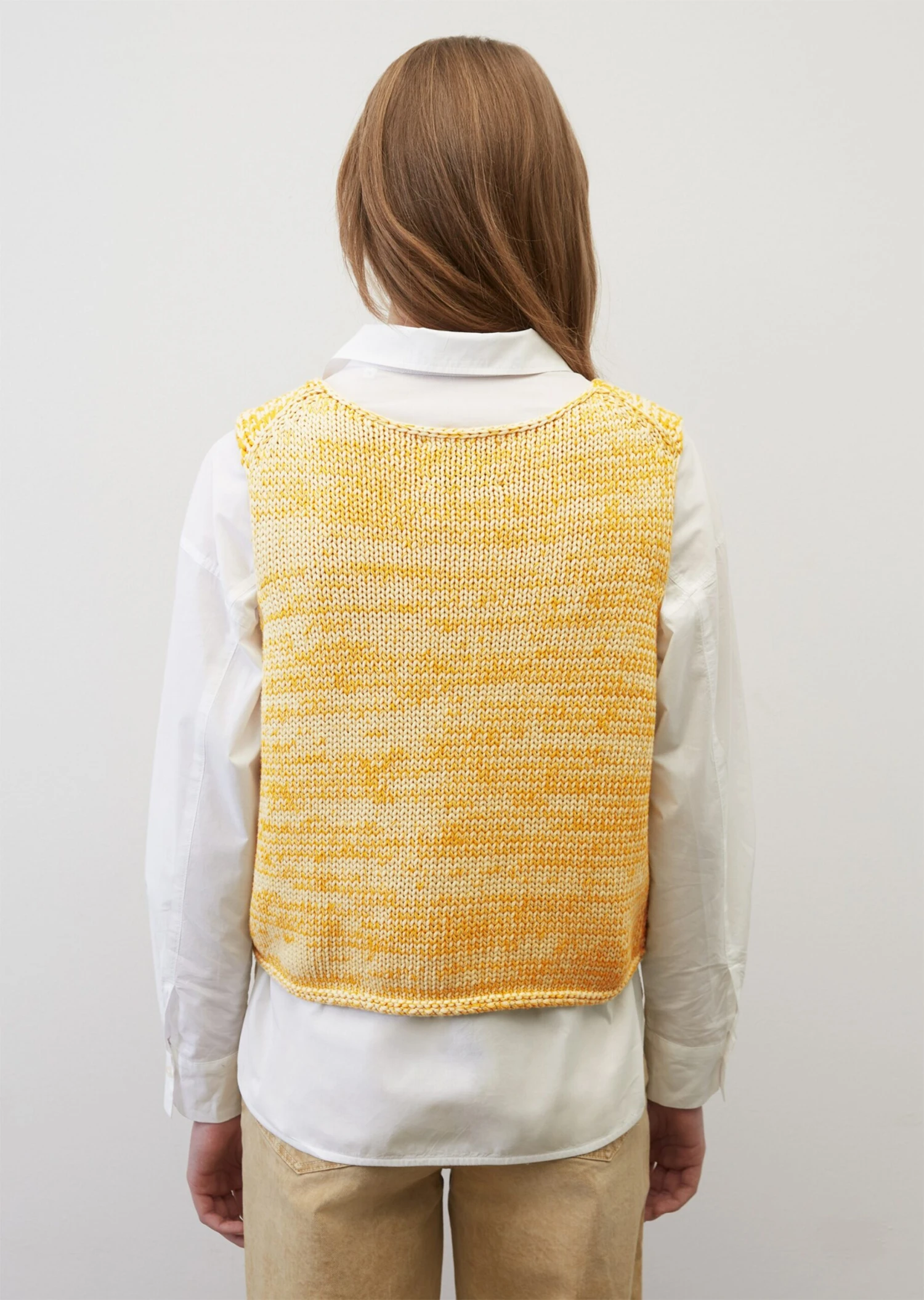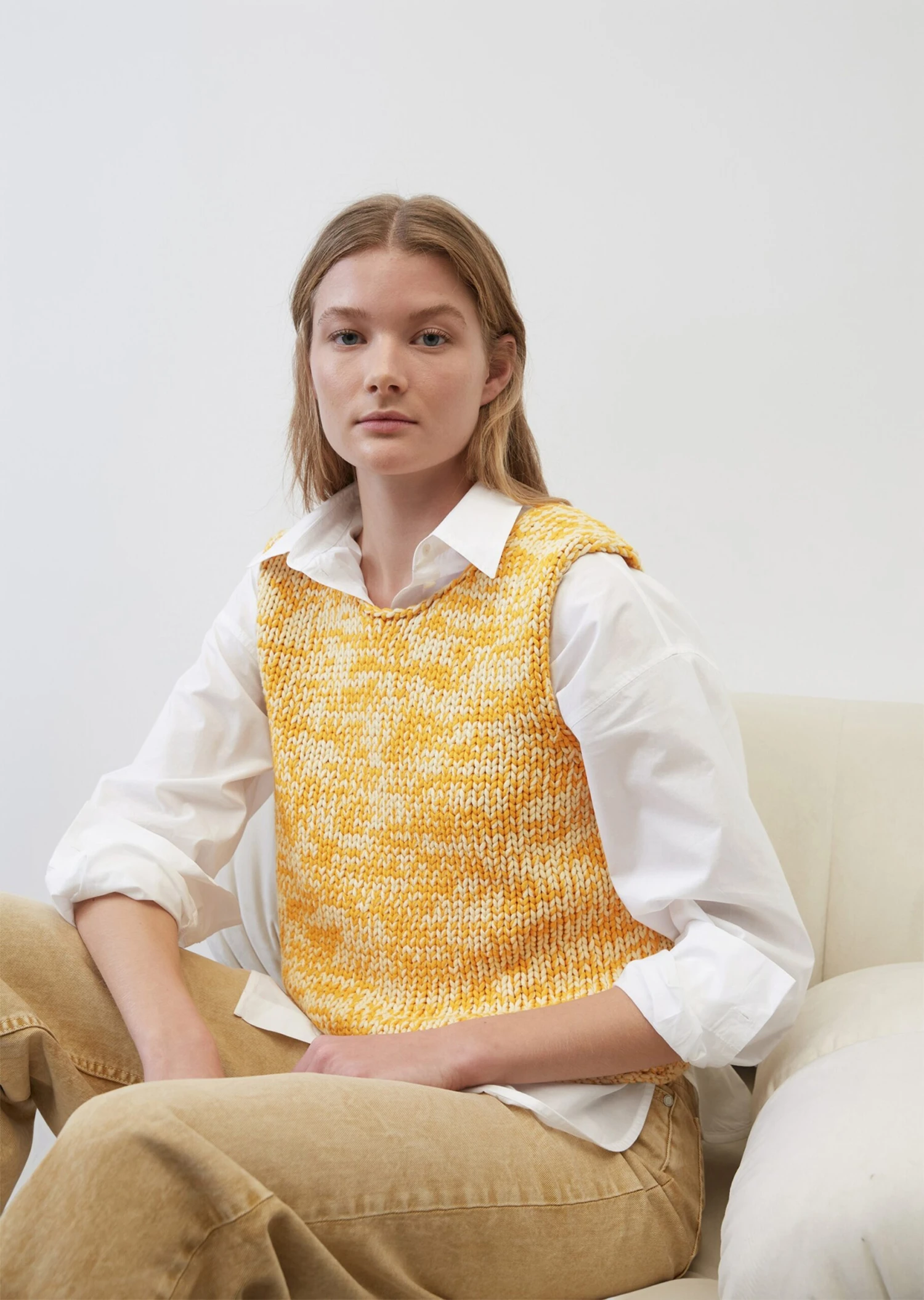 This super soft sleeveless jumper boasts a causal hand-knitted finish. It is made of high-quality cotton blend mouliné yarn in an exciting two-tone look. The jumper comes in a straight, regular fit with a wide round neckline, dropped shoulders and classic armholes. This piece of sleeveless knitwear can be worn all year round – on bare skin in warm weather and as part of a casual, layered look on colder days.
